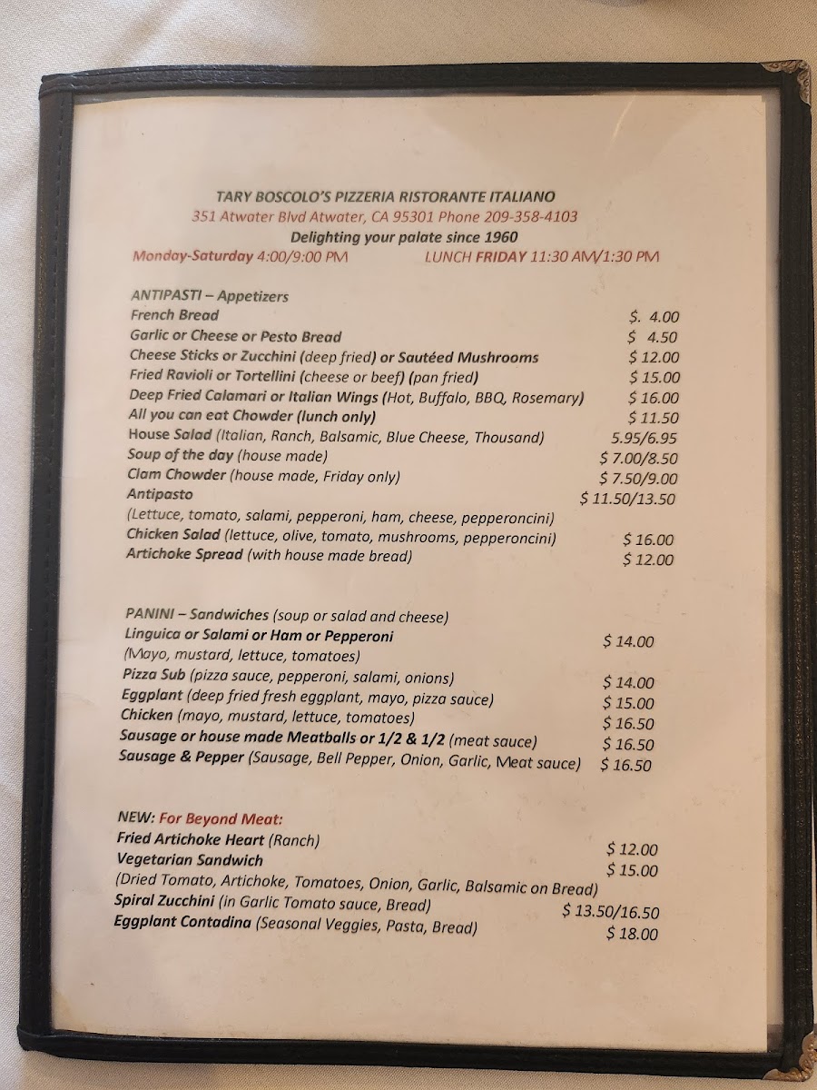 Welcome to Tary Boscolo's, a charming Italian gem nestled in Atwater, CA, where tradition and taste unite. The menu draws inspiration from classic Italian cuisine, delivering familiarity and flavor with every dish. Signature favorites like Chicken Marsala, Fettuccine Alfredo, and mouthwatering Garlic Pizza have captivated the hearts (and palates) of many locals, making it a must-visit for both residents and travelers alike.